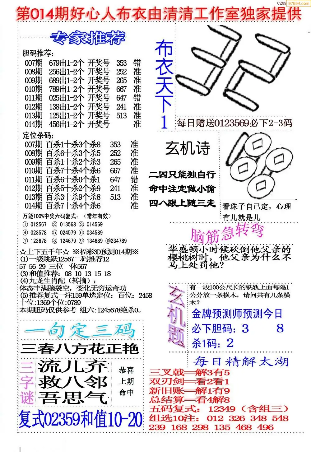 福彩014期3d真精华布衣+布衣早报(转载)