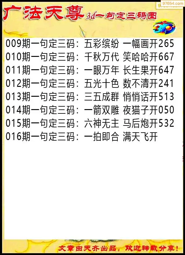 016期97654本站收集胆码出号预测