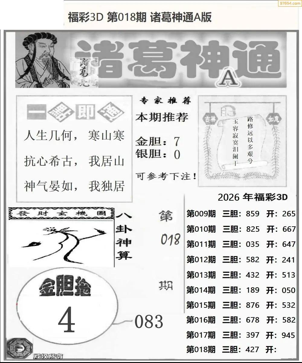 26018期福彩3D诸葛神通a