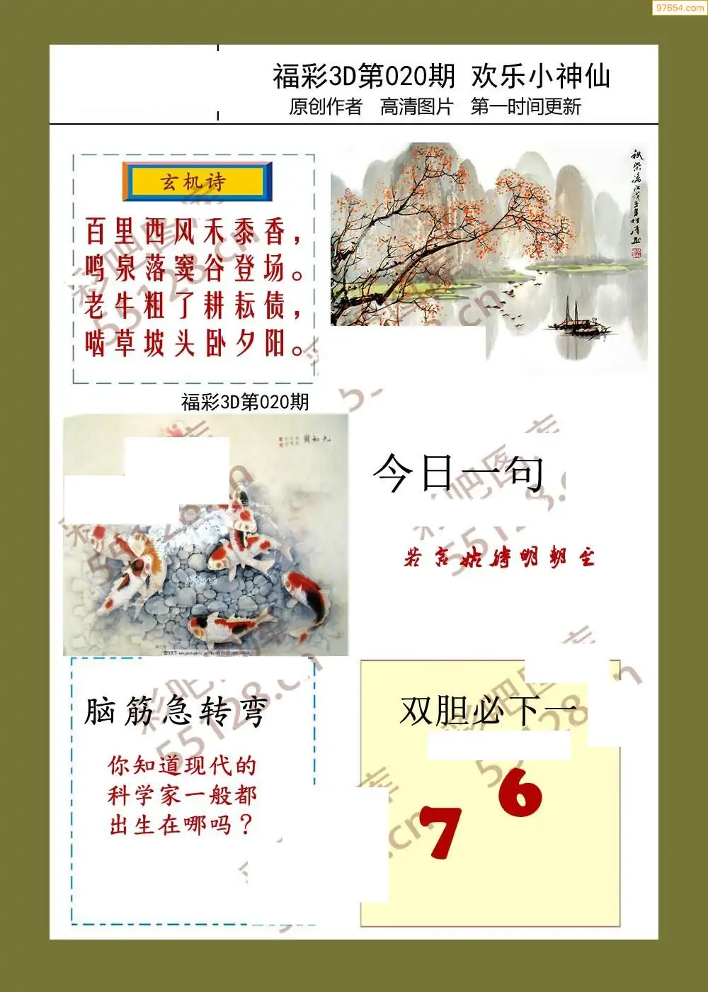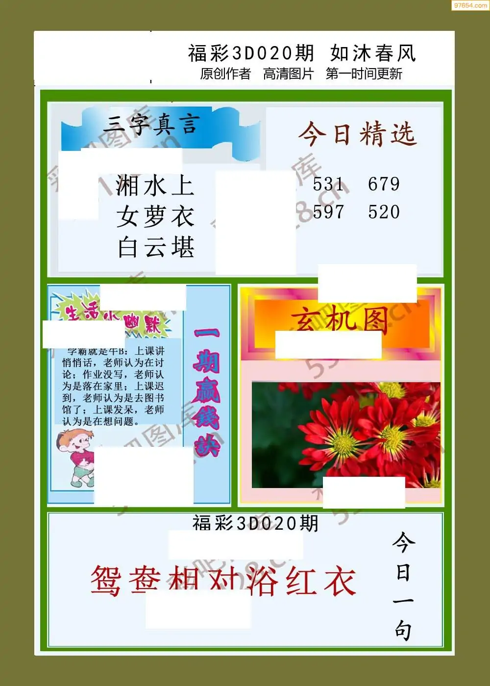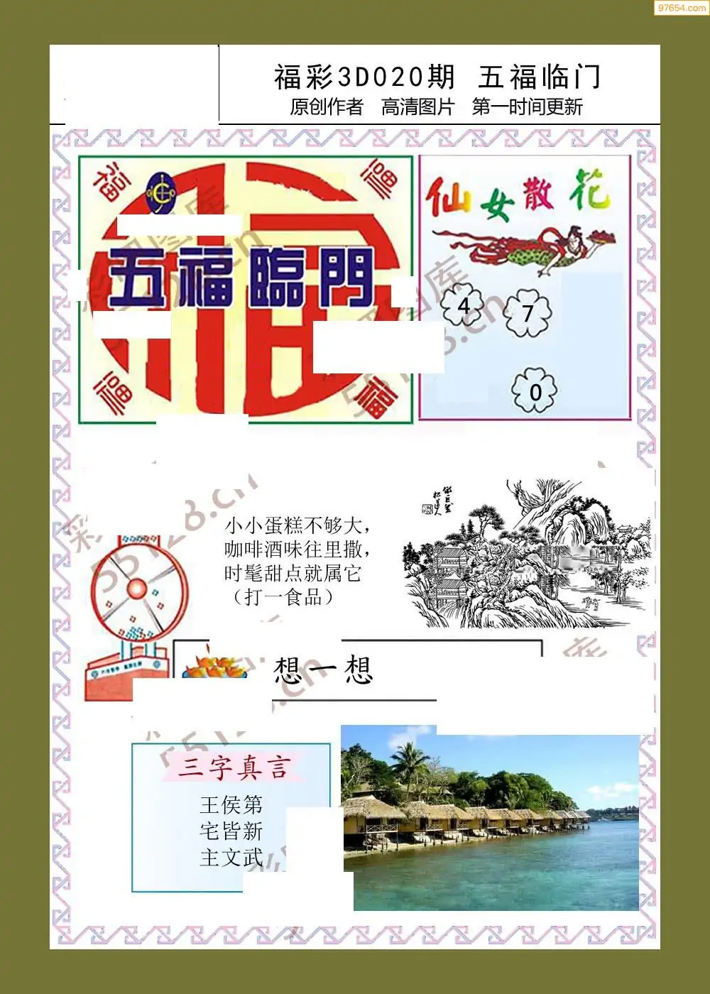福彩3D26020期蓝仙子一句定三码图谜