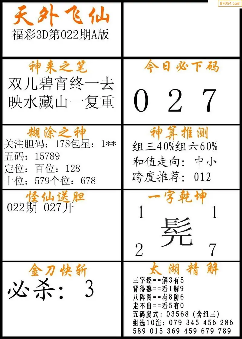 022期福彩3d天外飞仙A版