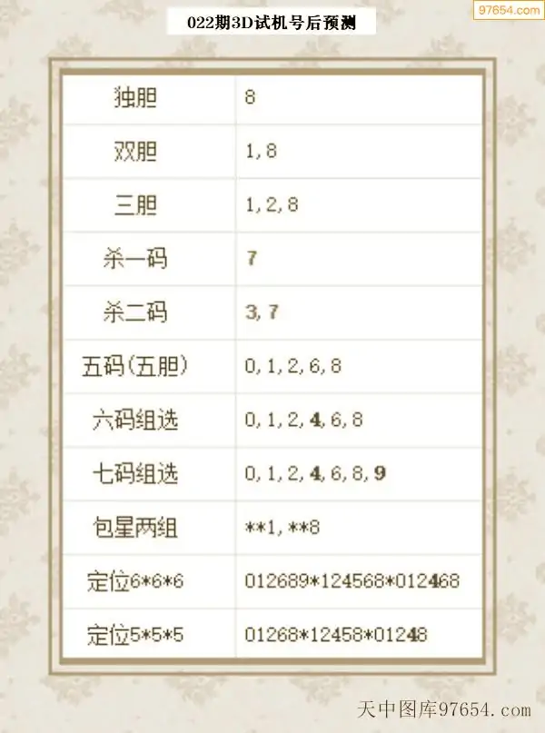 022期铜墙铁壁3D试机号预测