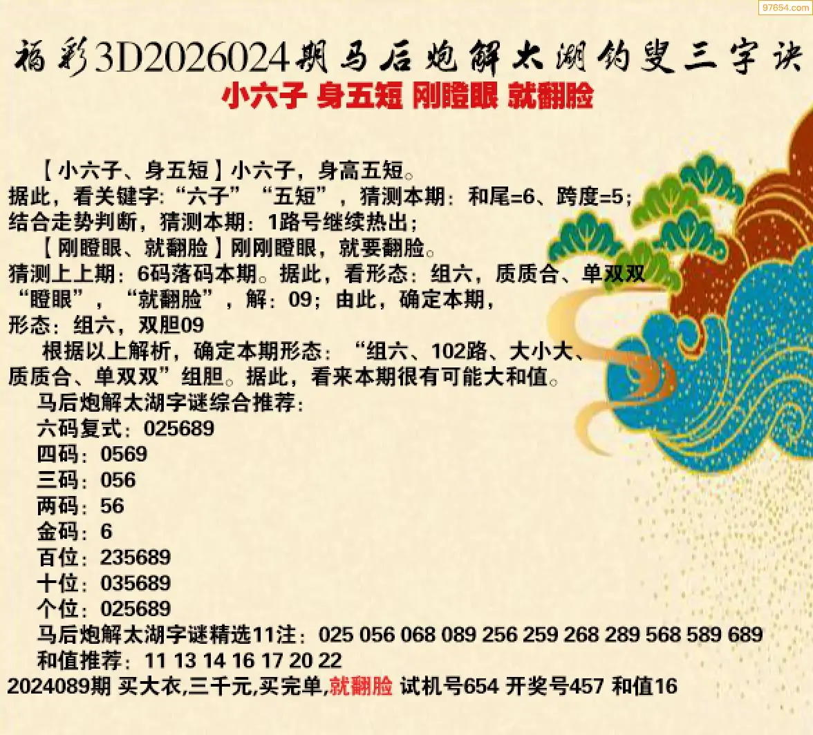26年024期马后炮解3d太湖钓叟之 小六子