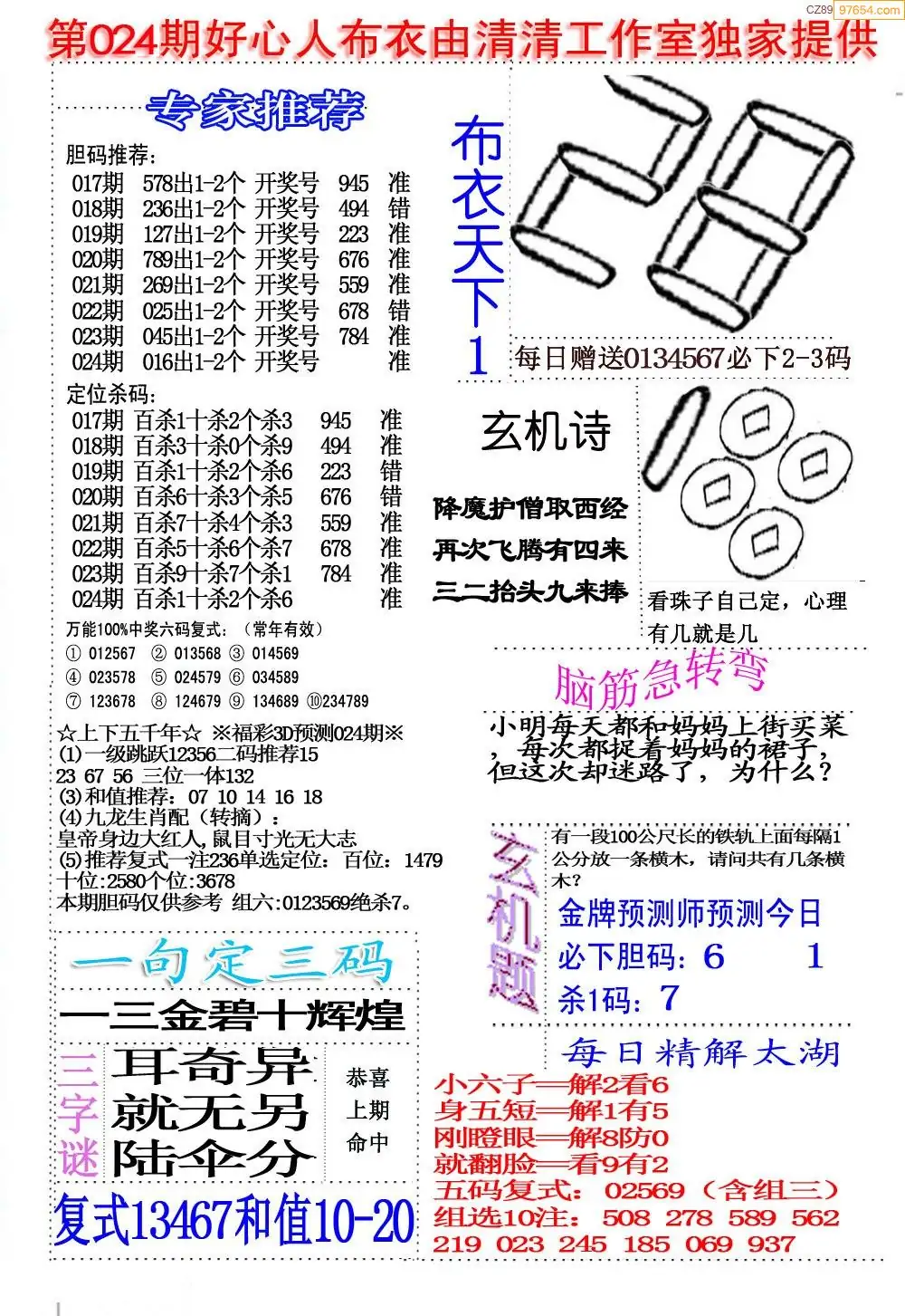 福彩024期3d真精华布衣+布衣早报(转载)