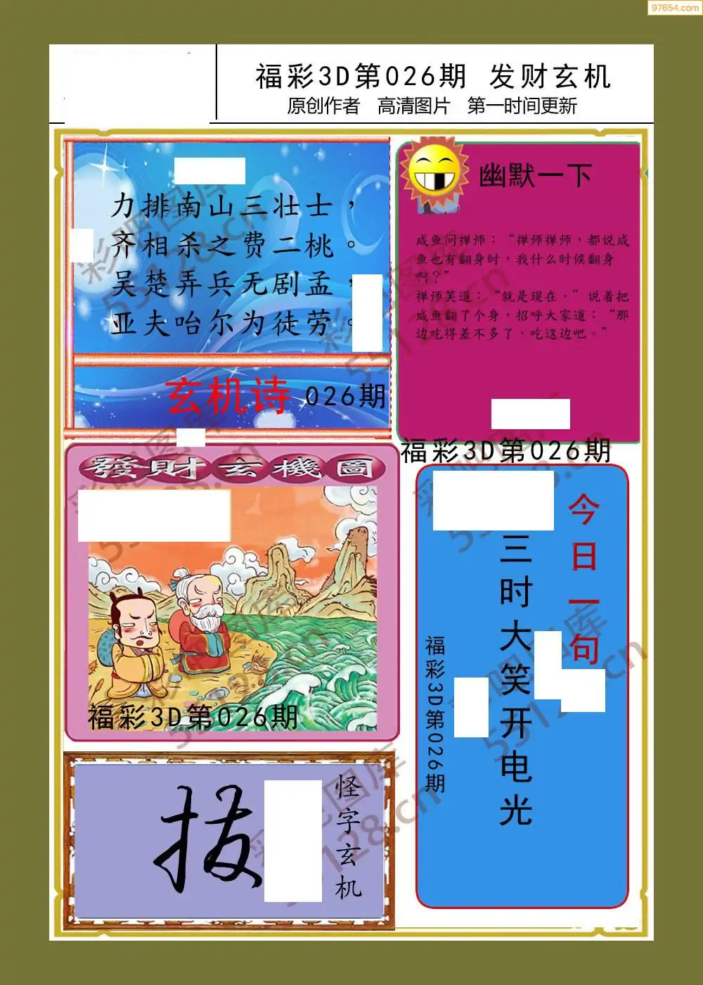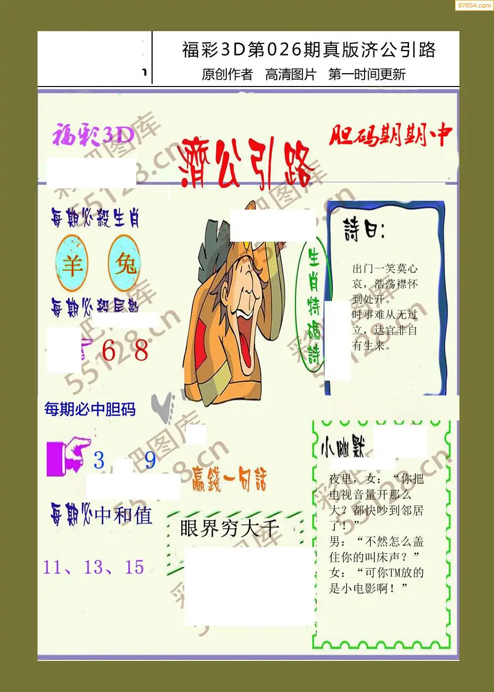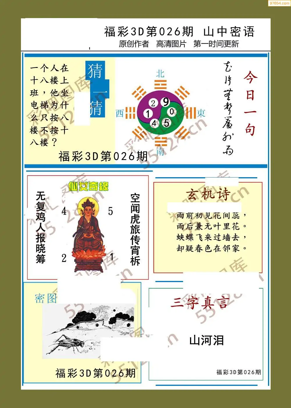 福彩3D26026期蓝仙子一句定三码图谜