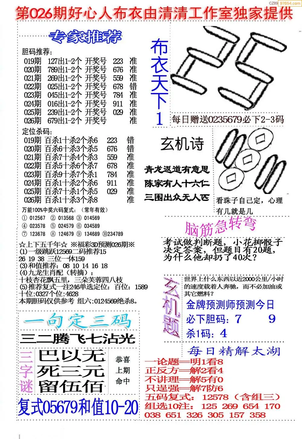 福彩026期3d真精华布衣+布衣早报(转载)