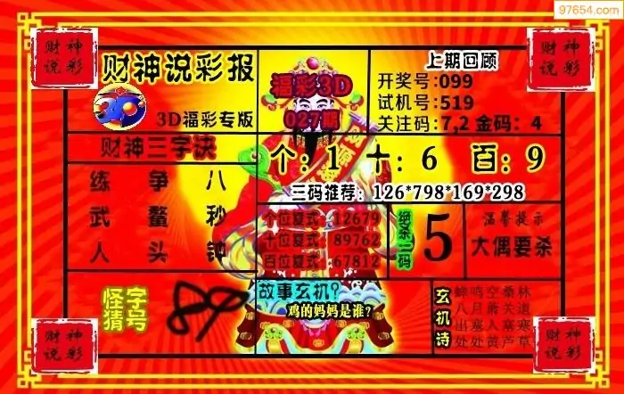 26年027期财神说彩3D综合图(原创)_3d财神到财神送胆