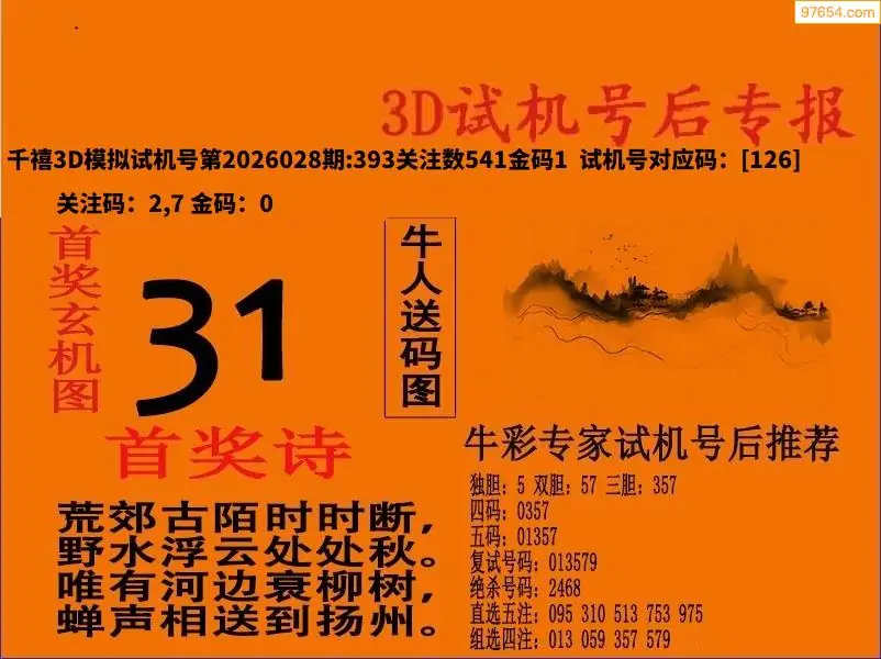 26028期福彩3D试机号后首奖诗