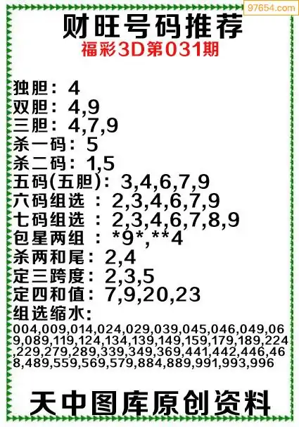 031期97654本站收集胆码出号预测