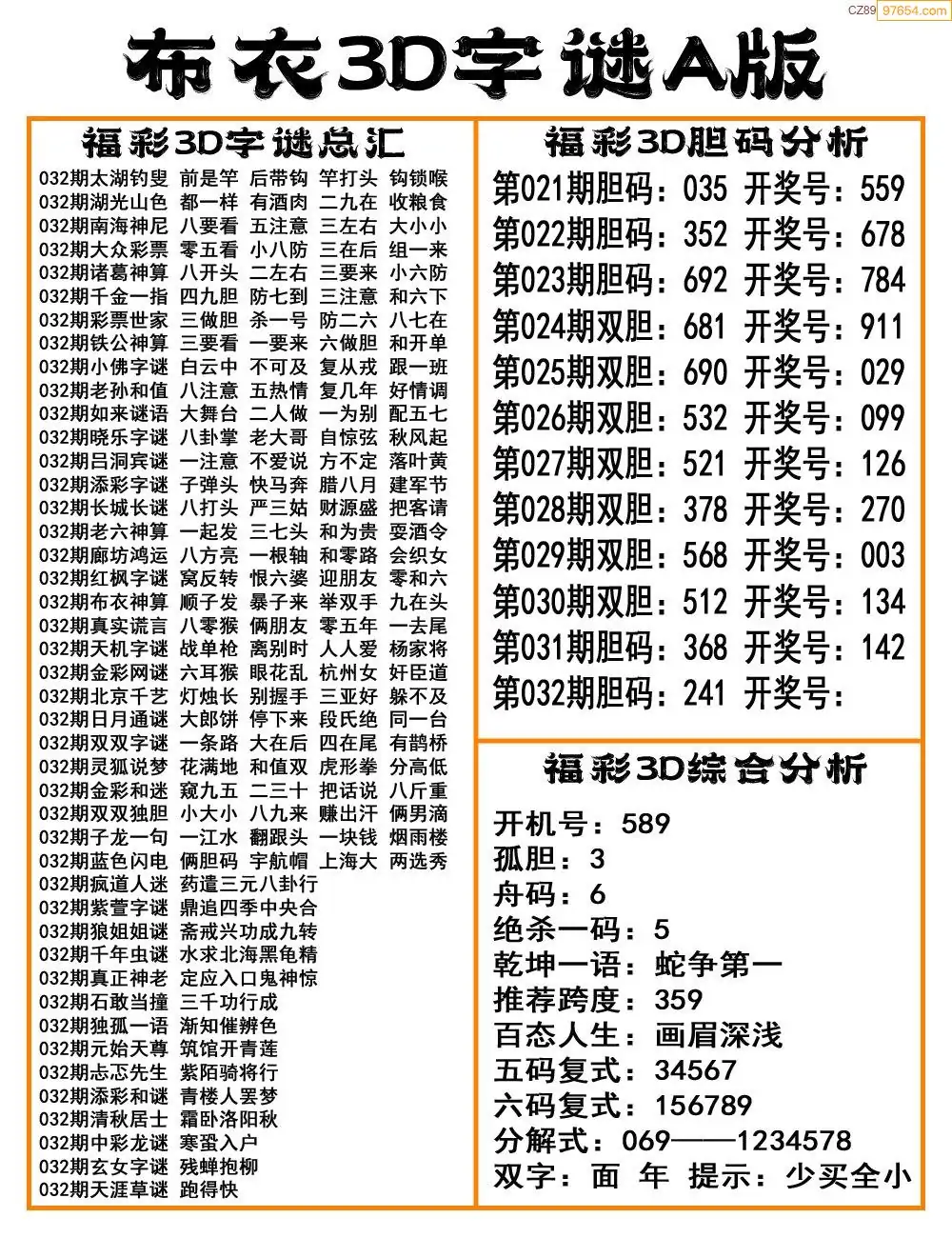 福彩26032期布衣3d字谜ab
