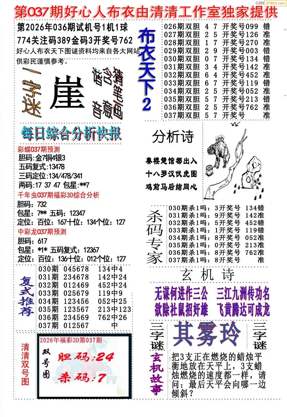 福彩26037期布衣3d字谜ab