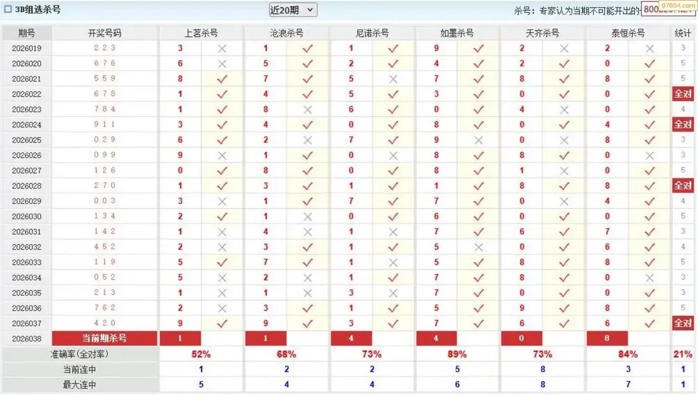 杀号王今晚3d杀一号码038期 6连中