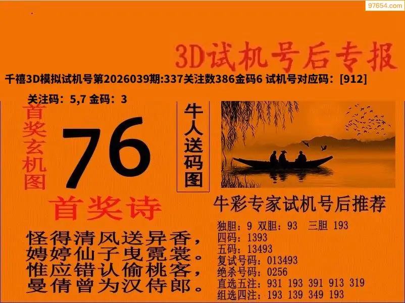 26039期福彩3D试机号后首奖诗