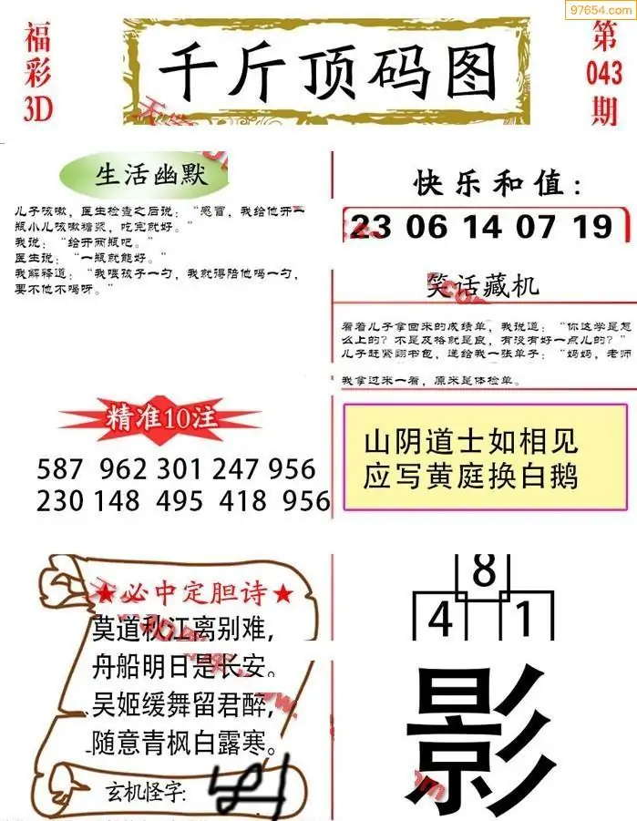 福彩3D26043期蓝仙子一句定三码图谜