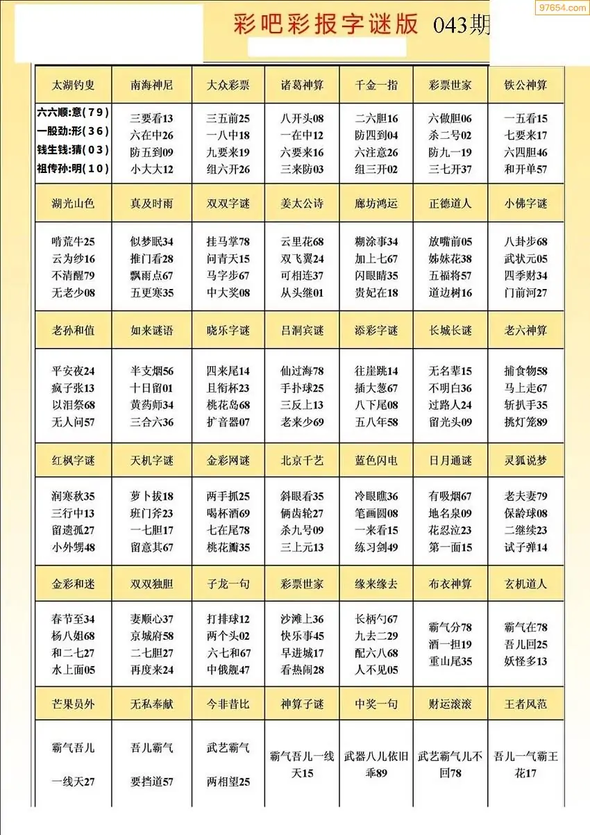 043期3D牛彩预测报+彩吧字谜报
