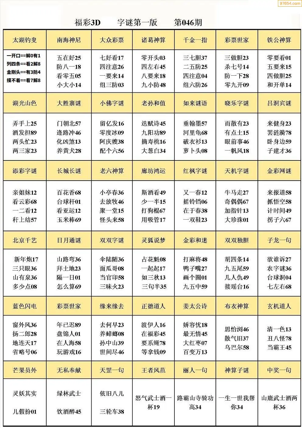 046期3D牛彩预测报+彩吧字谜报