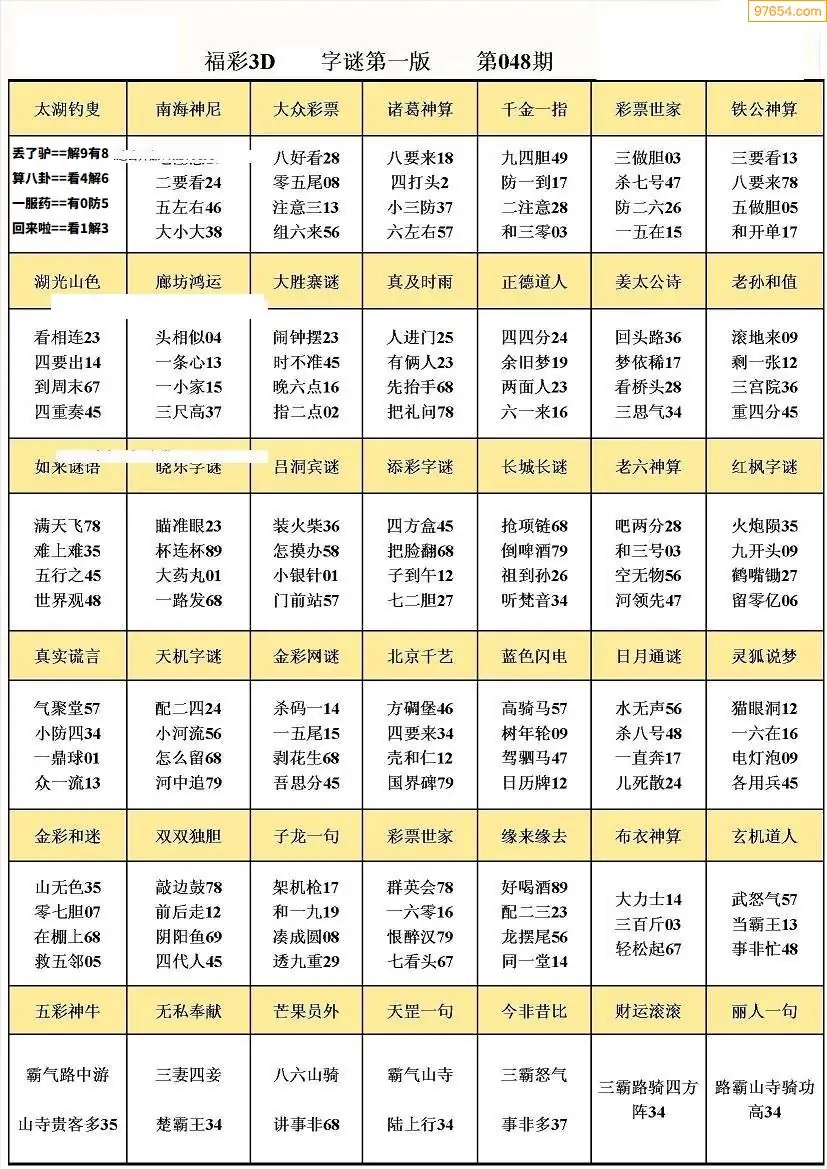 048期3D牛彩预测报+彩吧字谜报