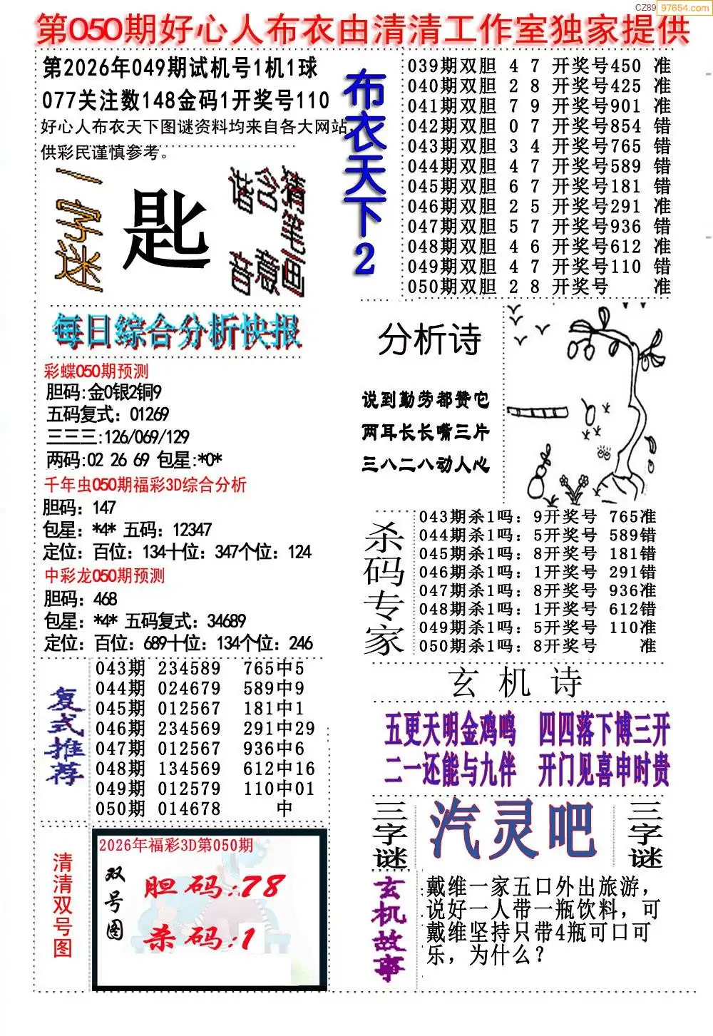 福彩26050期布衣3d字谜ab