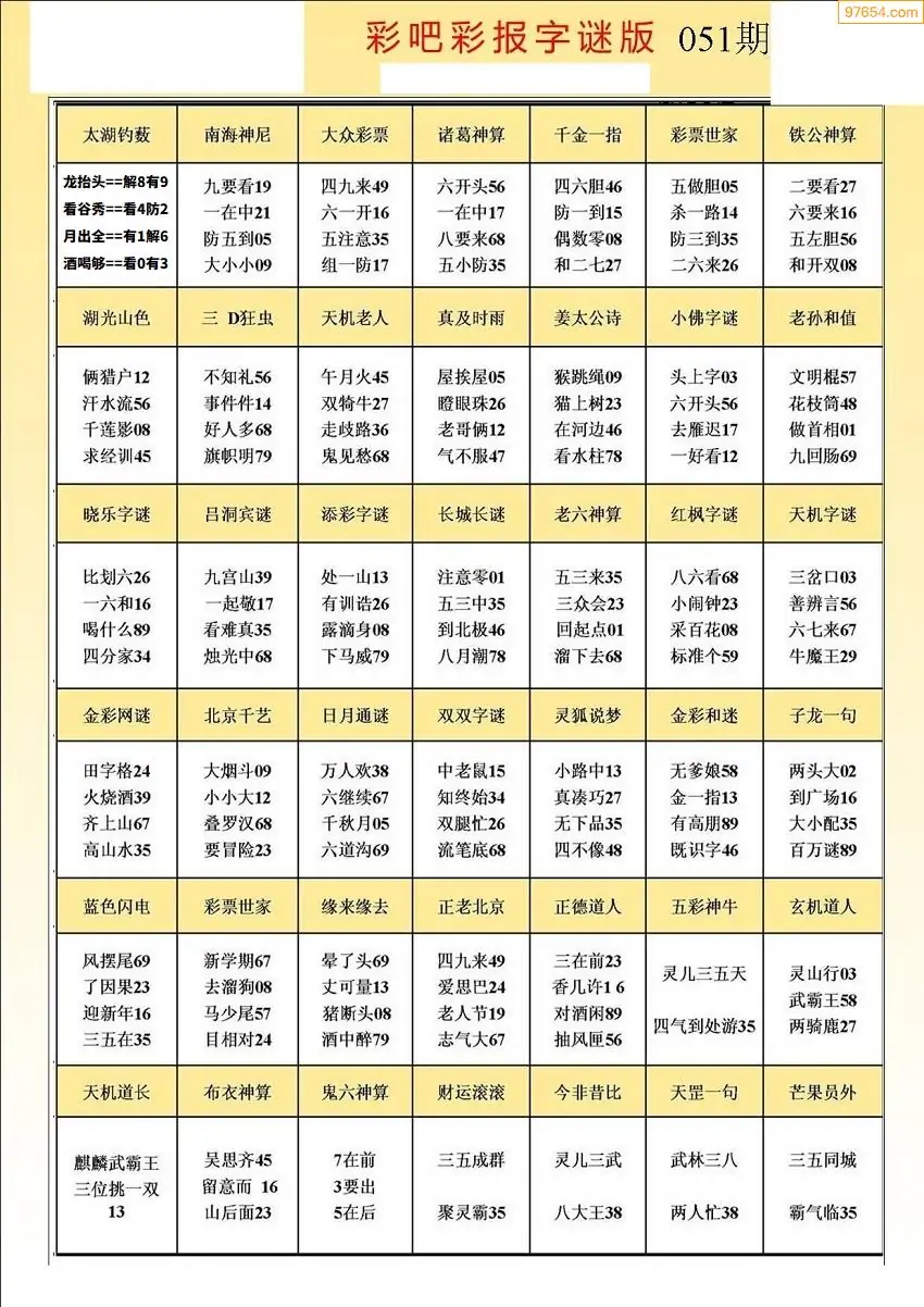 051期3D牛彩预测报+彩吧字谜报