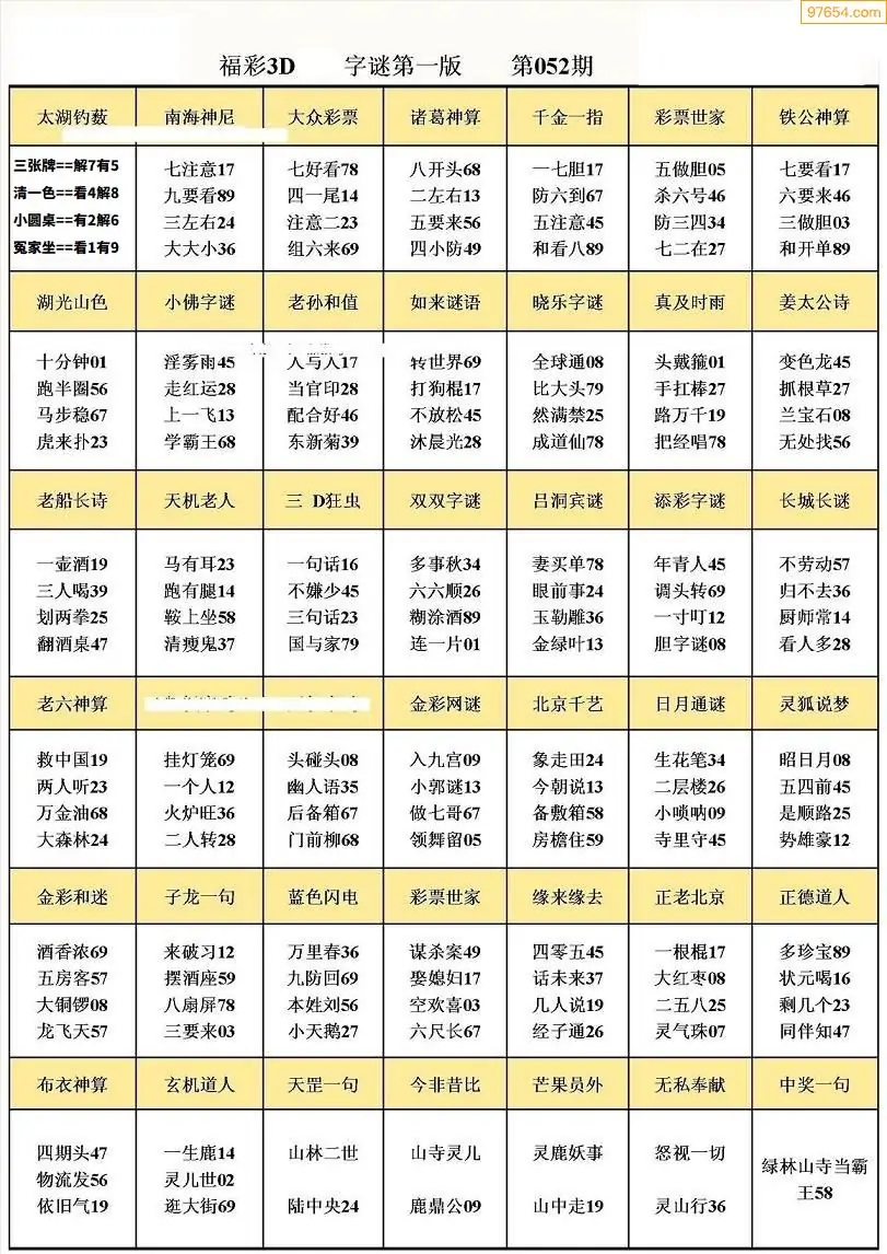 052期3D牛彩预测报+彩吧字谜报