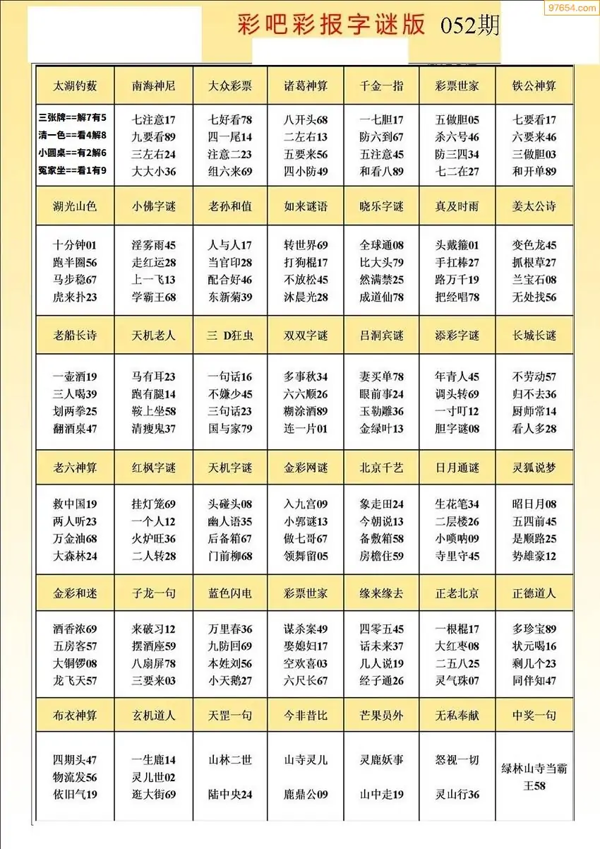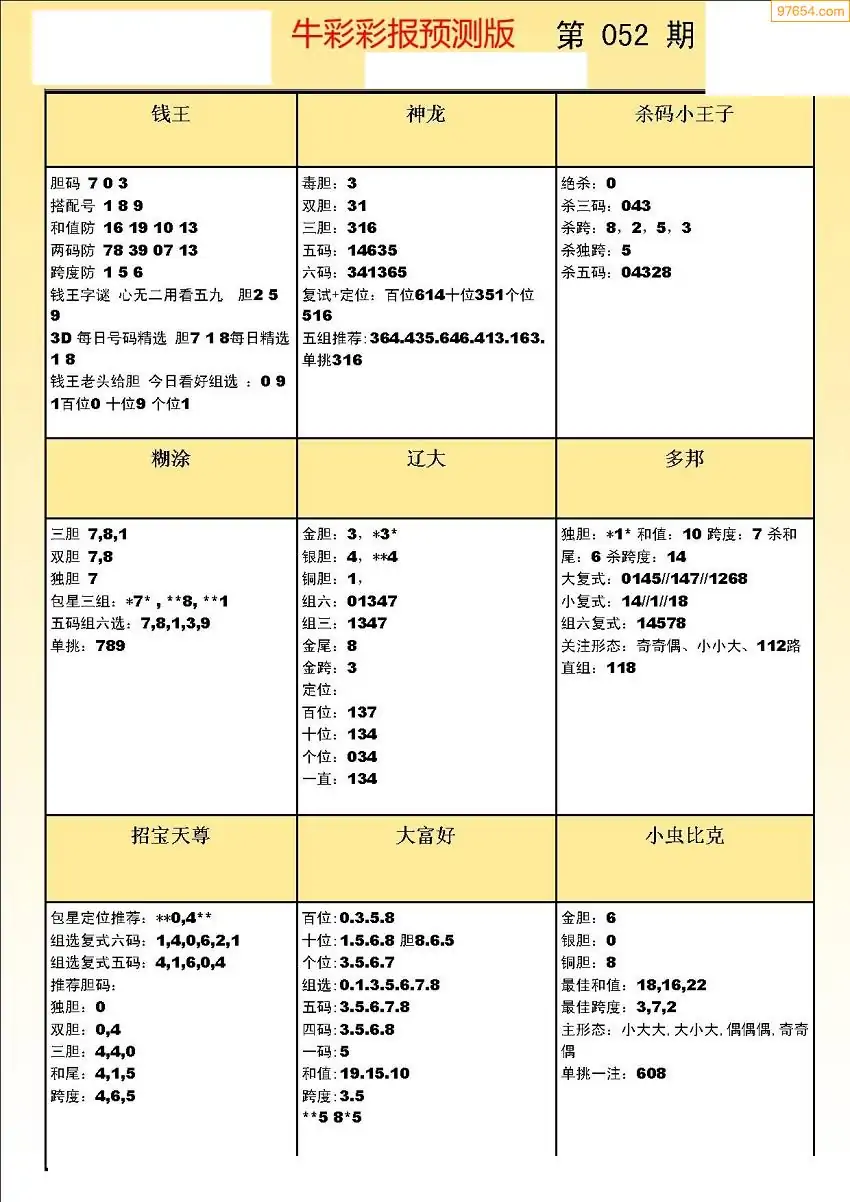 052期3D牛彩预测报+彩吧字谜报