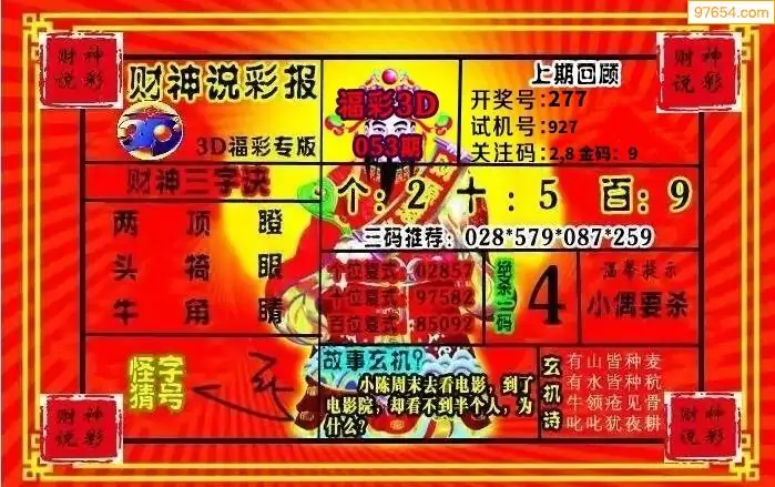 26年053期财神说彩3D综合图(原创)_3d财神到财神送胆