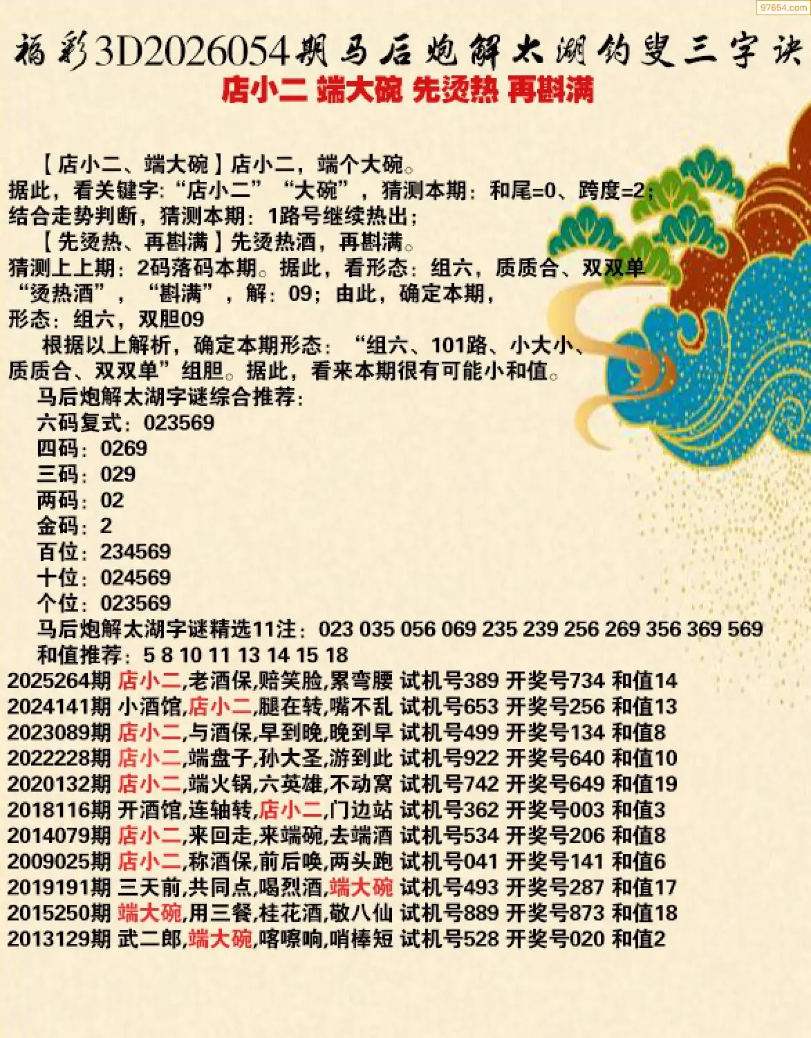 26年054期马后炮解3d太湖钓叟之 店小二