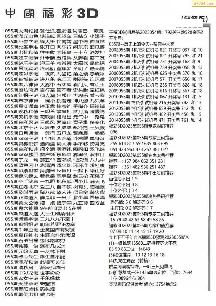 福彩3D055期天牛彩吧套图整合总汇