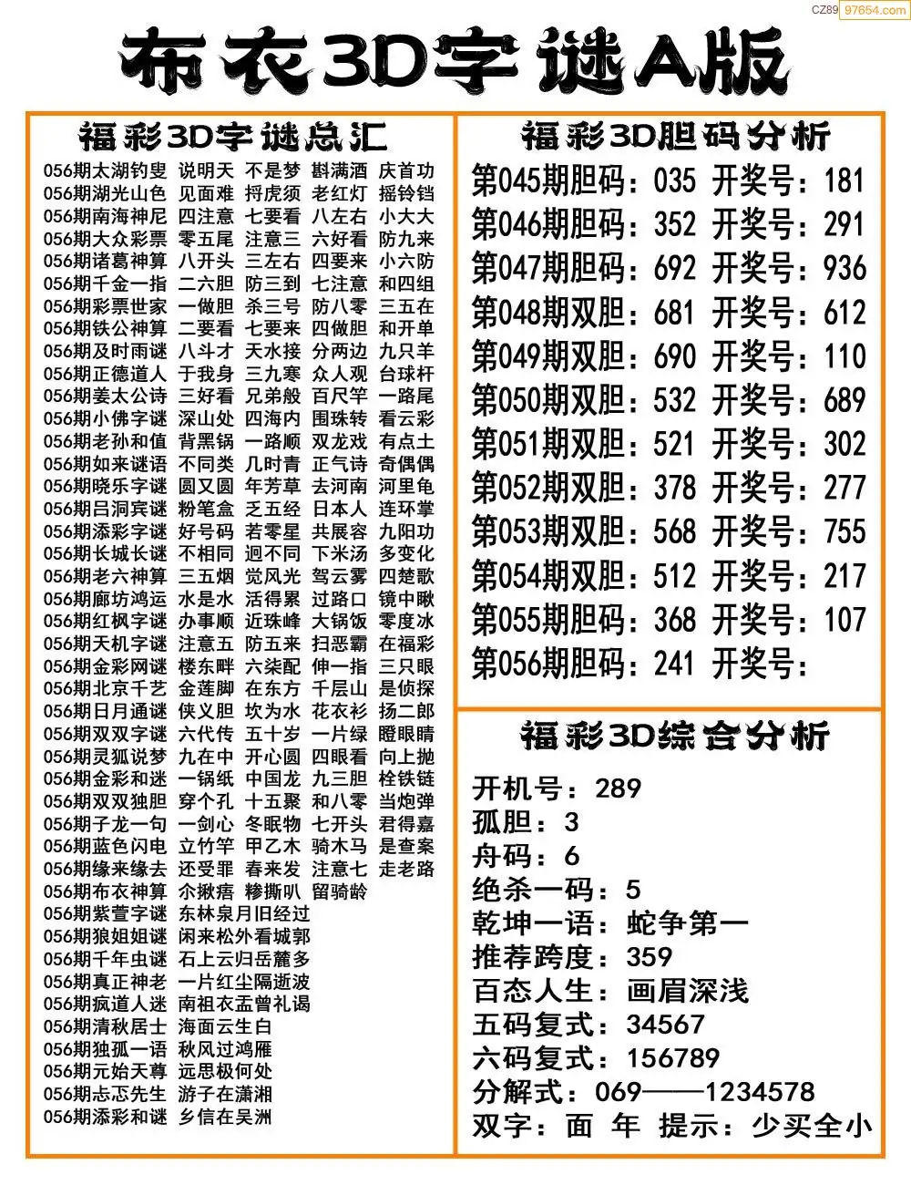福彩26056期布衣3d字谜ab