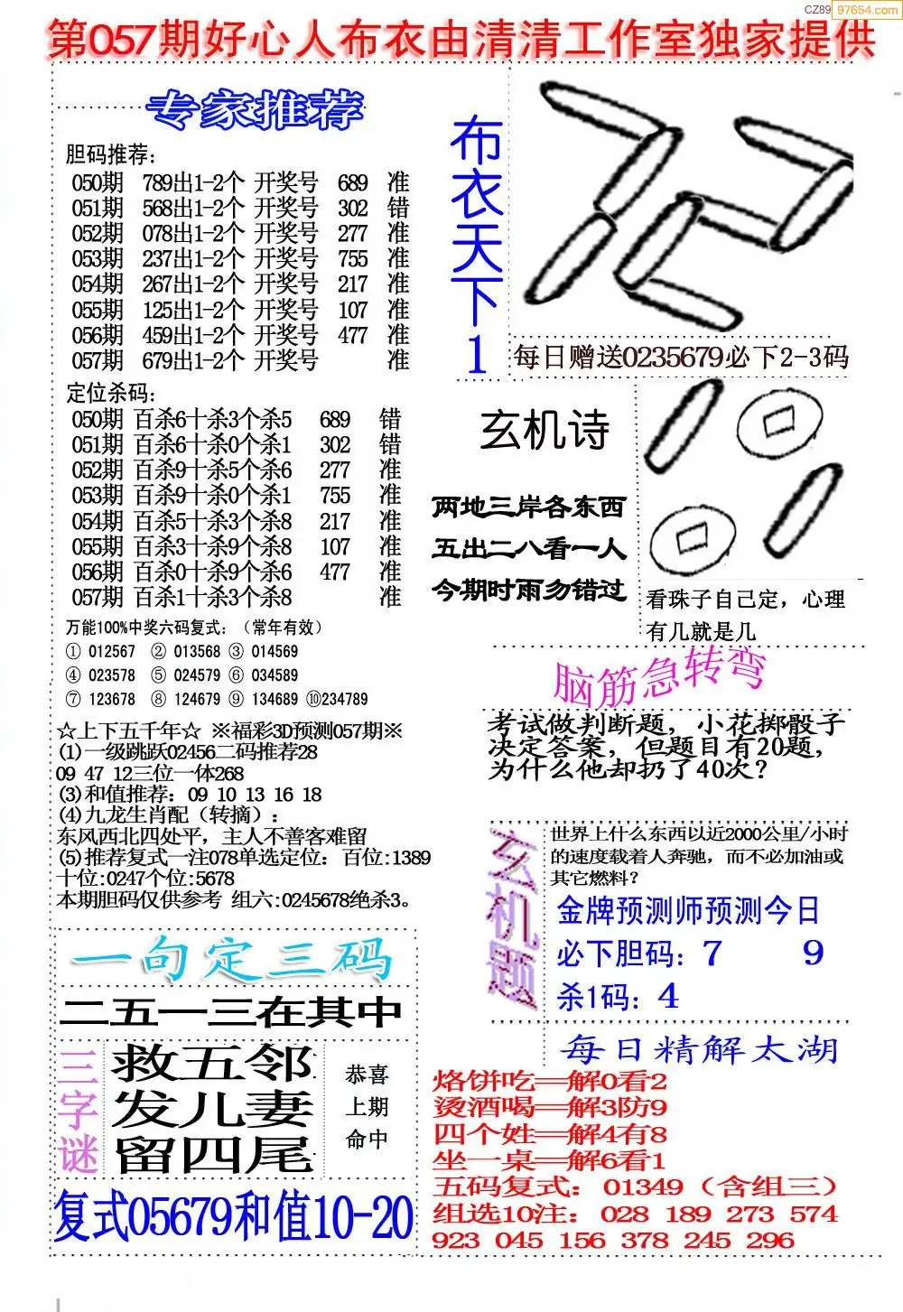 福彩057期3d真精华布衣+布衣早报(转载)