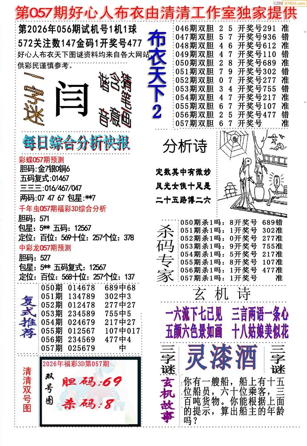 福彩26057期布衣3d字谜ab