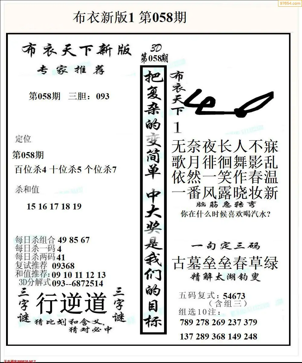 福彩058期3d真精华布衣+布衣早报(转载)
