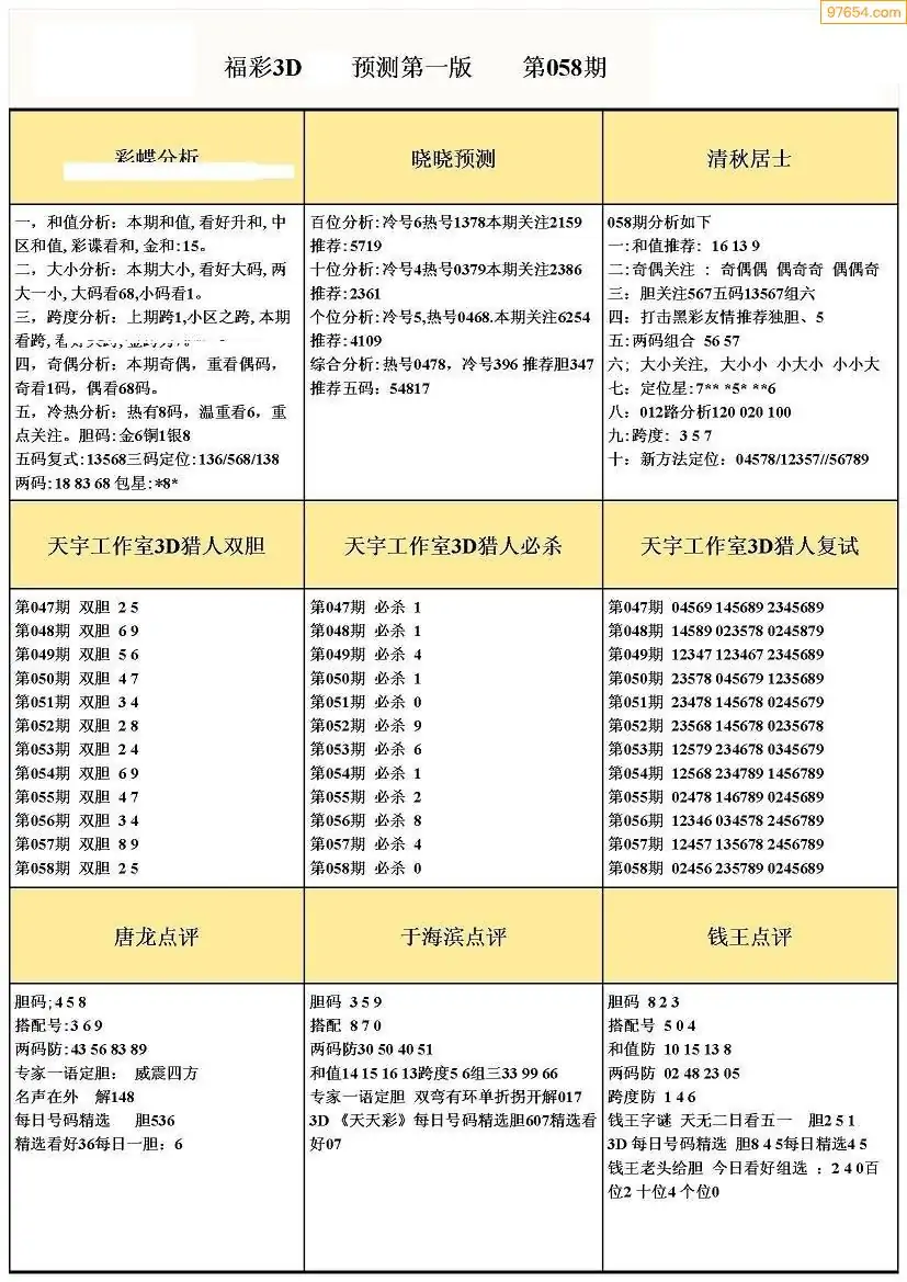 058期3D牛彩预测报+彩吧字谜报