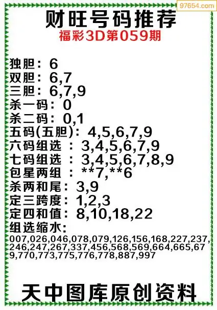 3D原创059期旺财出号推荐