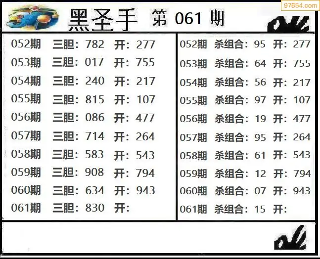061期97654本站收集胆码出号预测