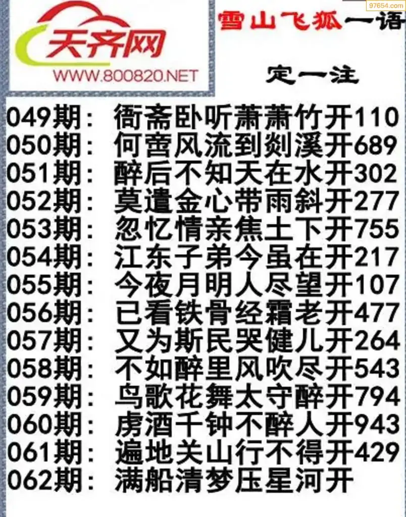 彩票3d字谜062期雪山飞狐一语定一注