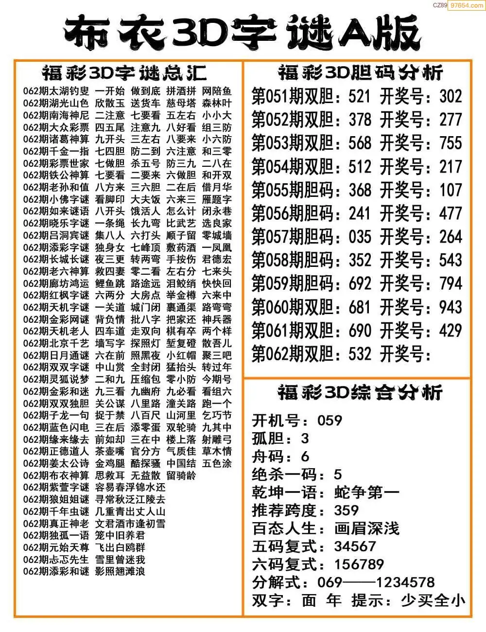 福彩26062期布衣3d字谜ab