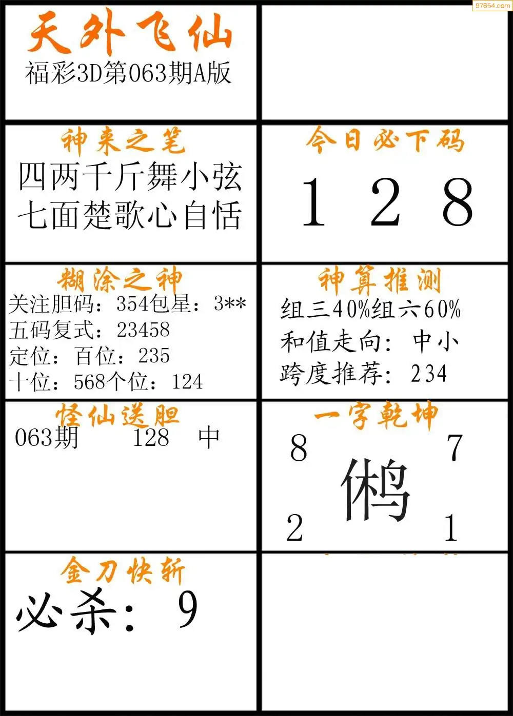 063期福彩3d天外飞仙A版