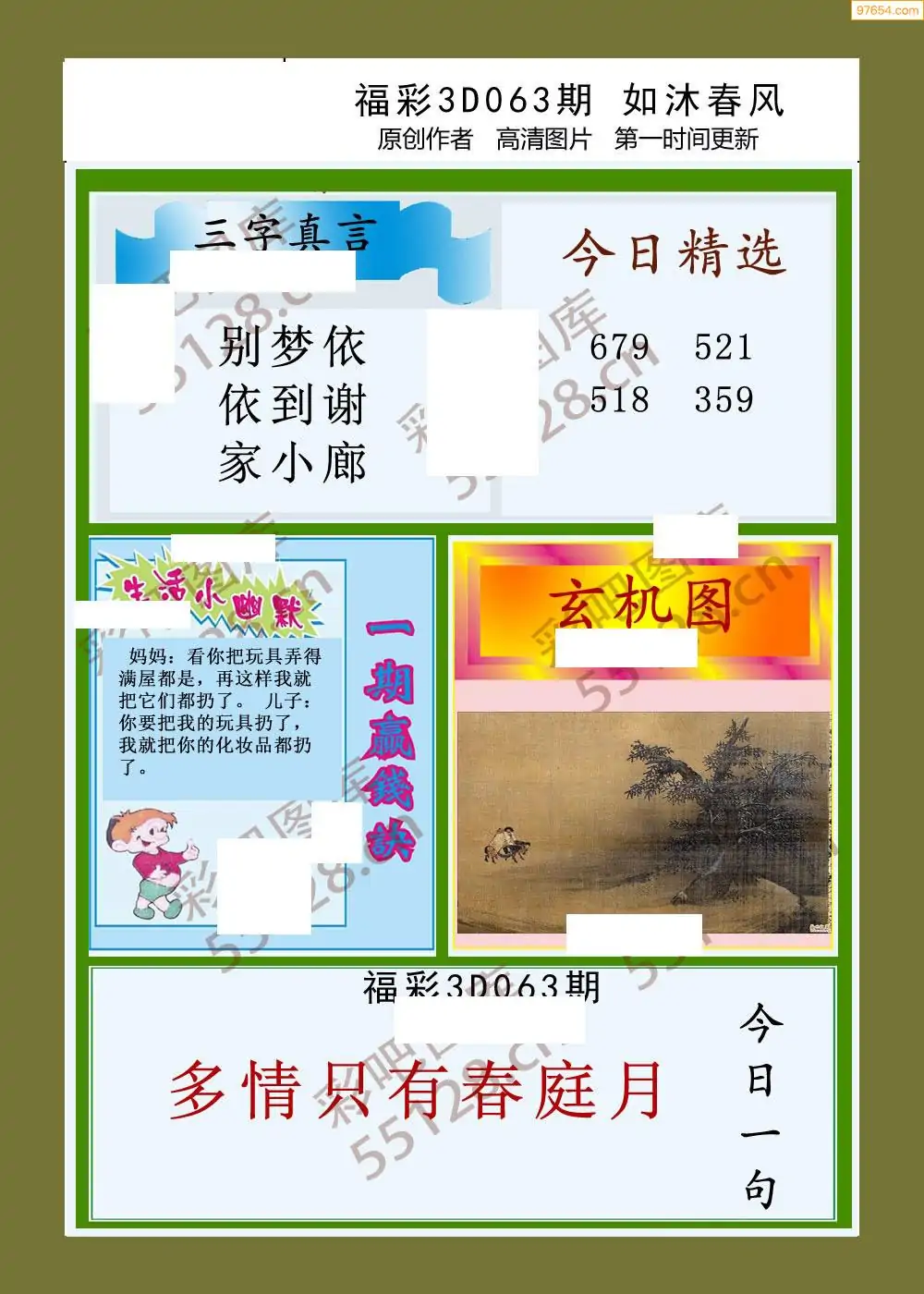 福彩3D26063期蓝仙子一句定三码图谜