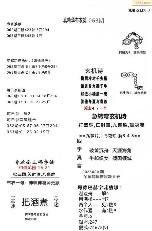 063期真版布衣神算专家推荐