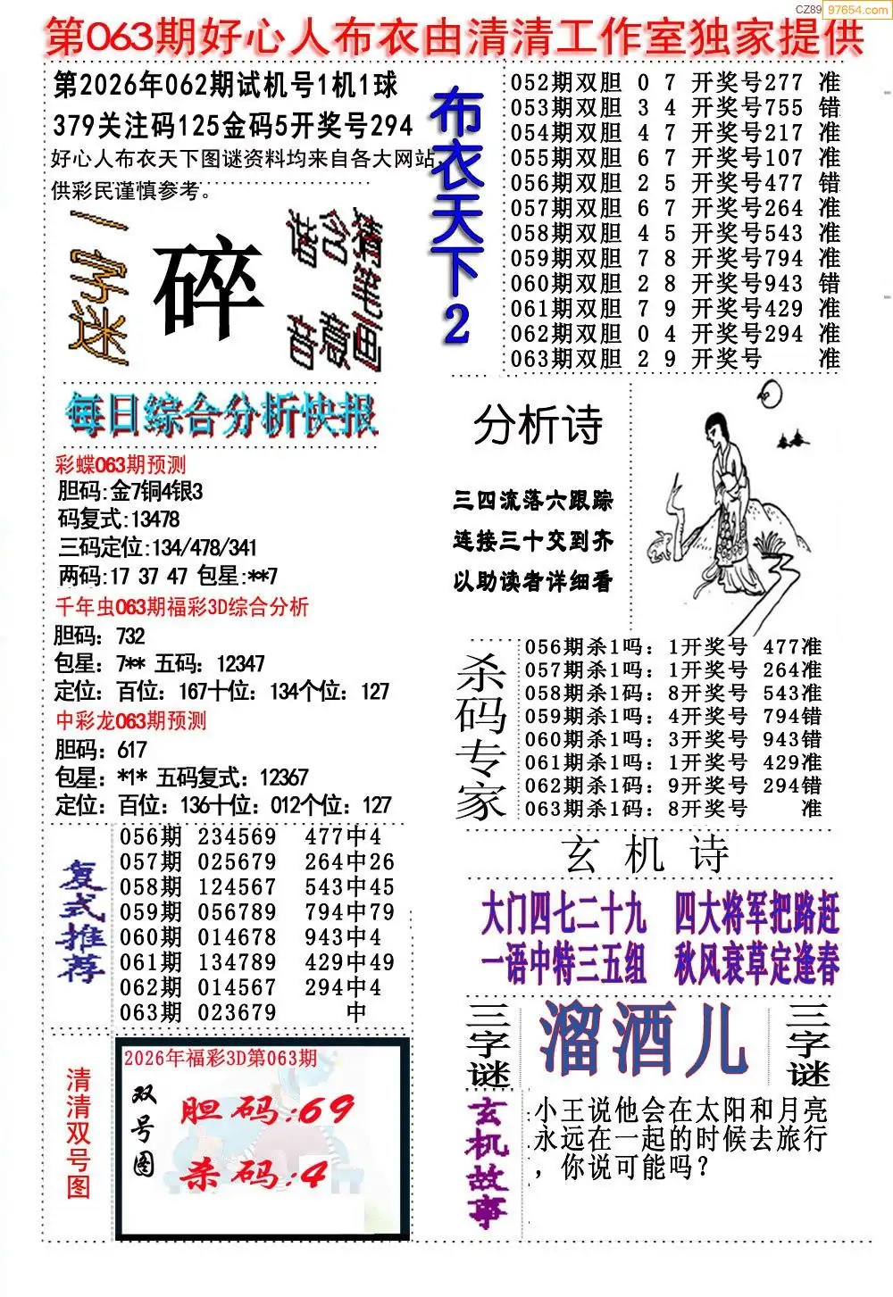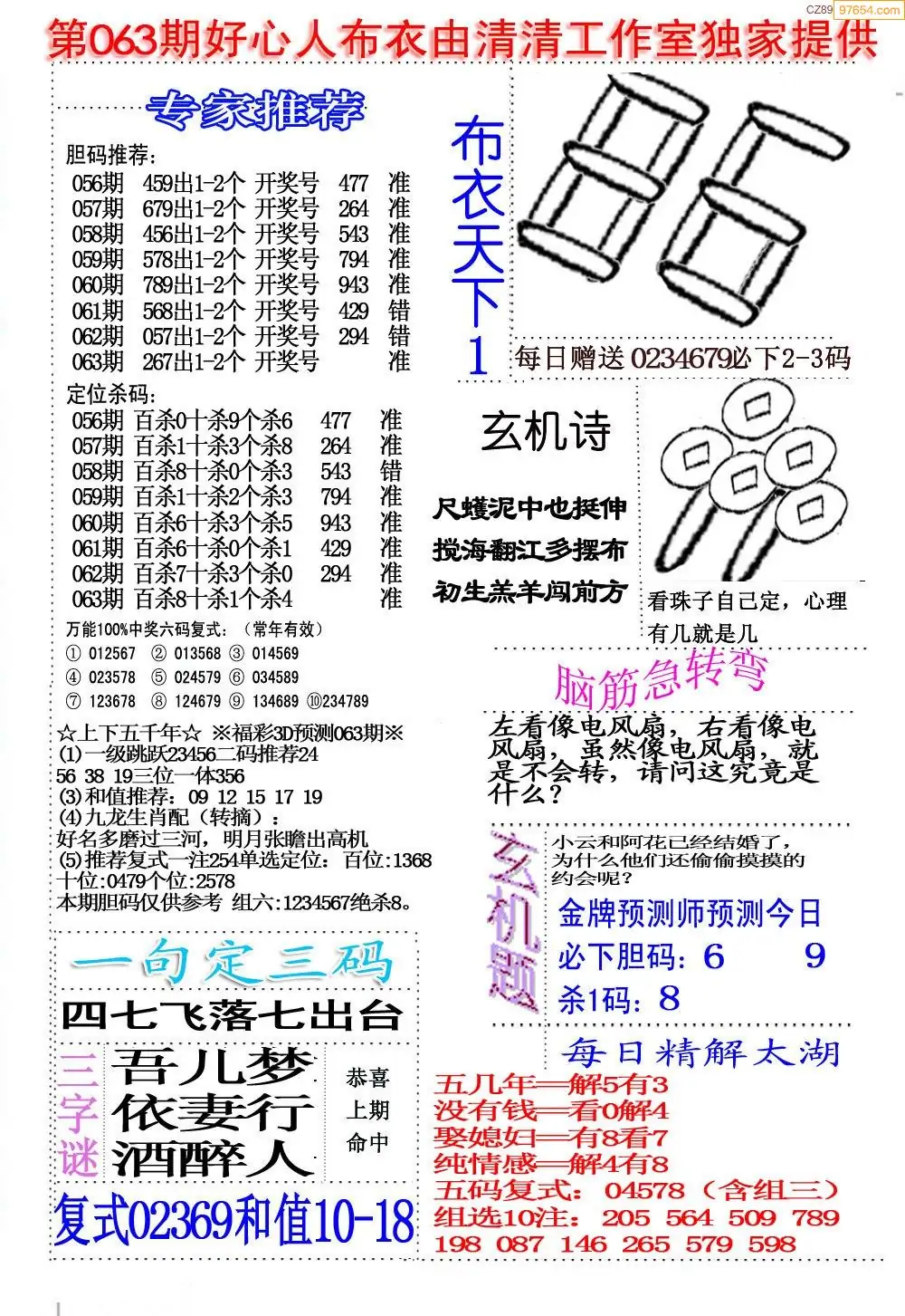 福彩063期3d真精华布衣+布衣早报(转载)