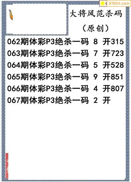 26年067期大将风范p3杀码体彩图谜