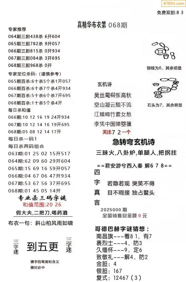 068期真版布衣神算专家推荐
