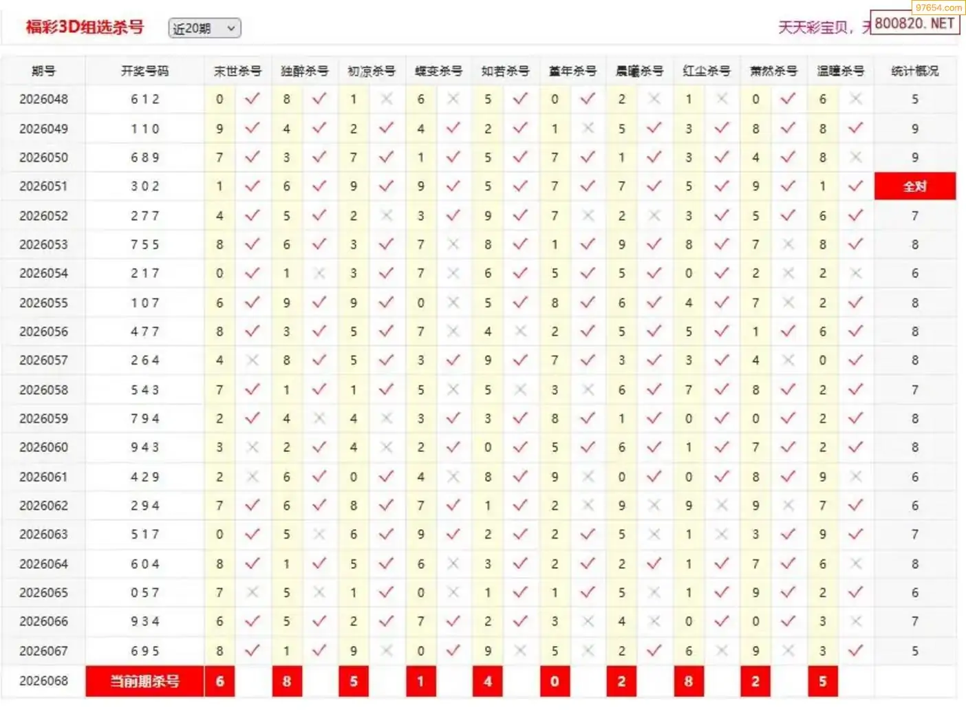 福彩3D26年068期于海滨杀独胆 8连中