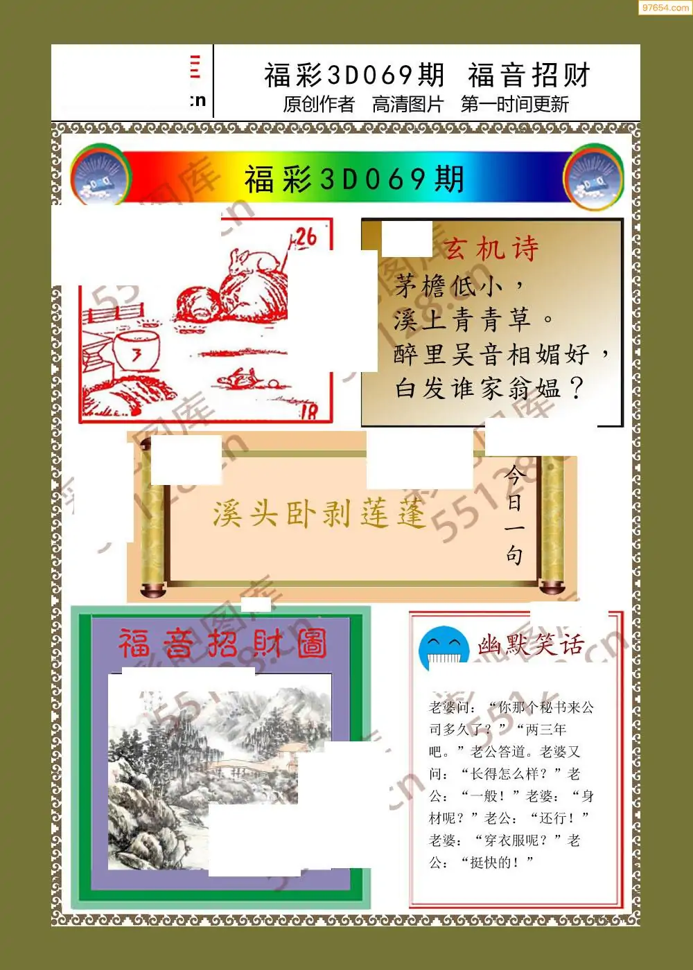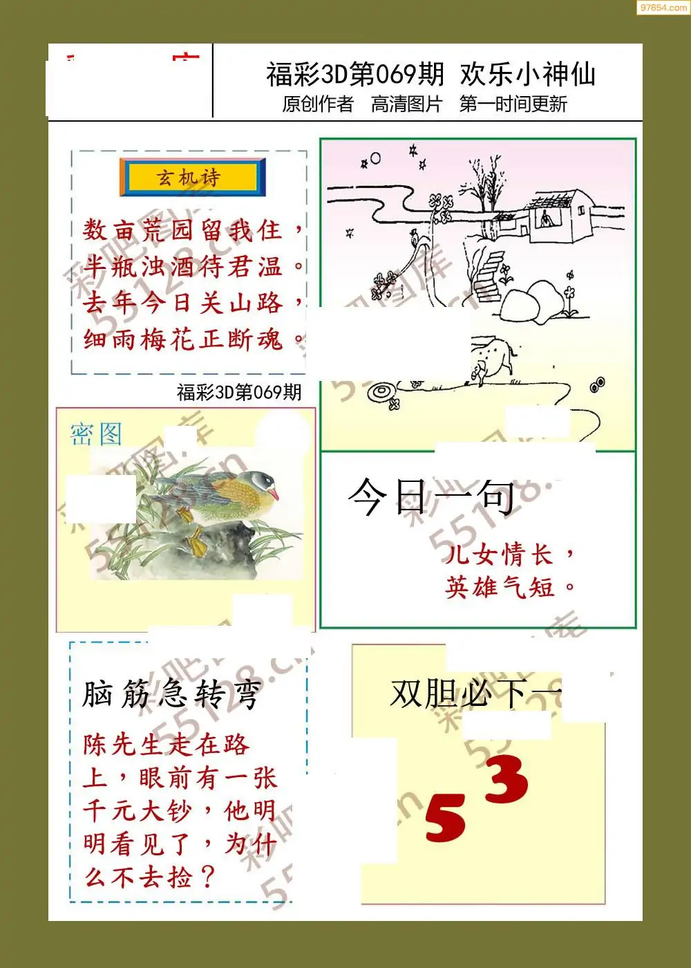福彩3D26069期蓝仙子一句定三码图谜