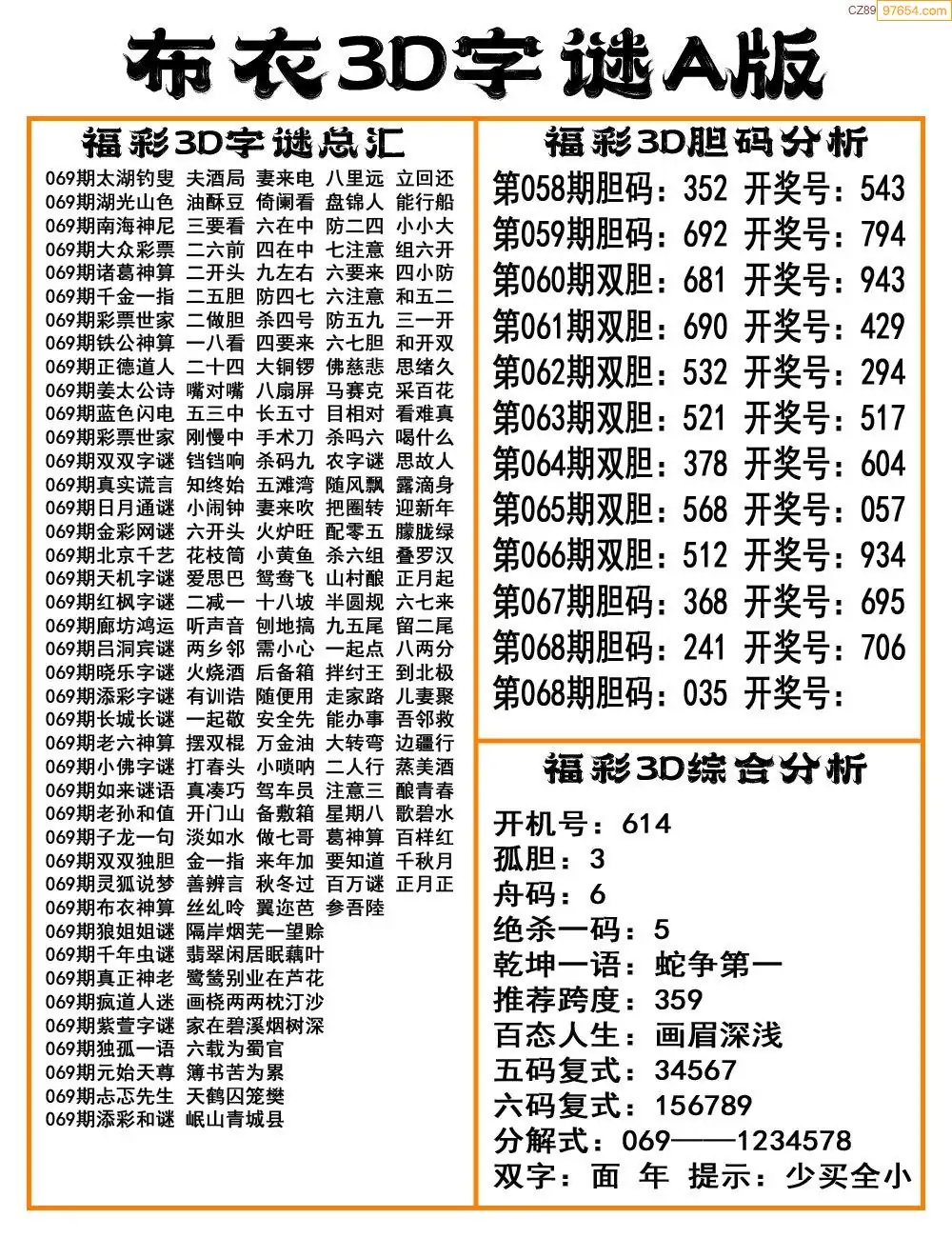 福彩26069期布衣3d字谜ab