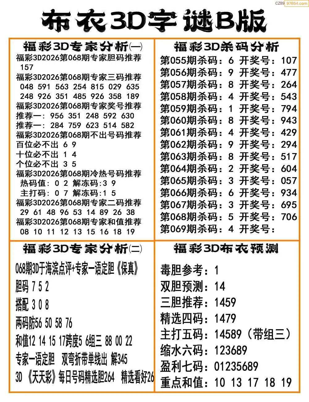 福彩069期3d真精华布衣+布衣早报(转载)