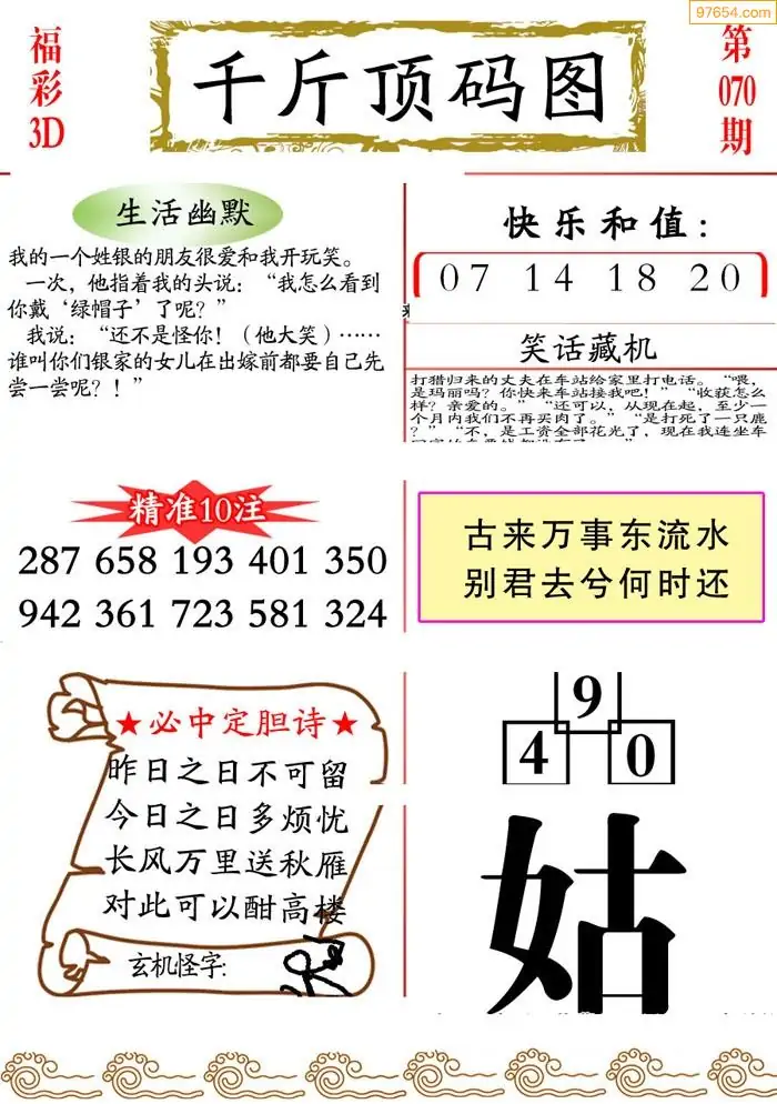 福彩3D26071期蓝仙子一句定三码图谜