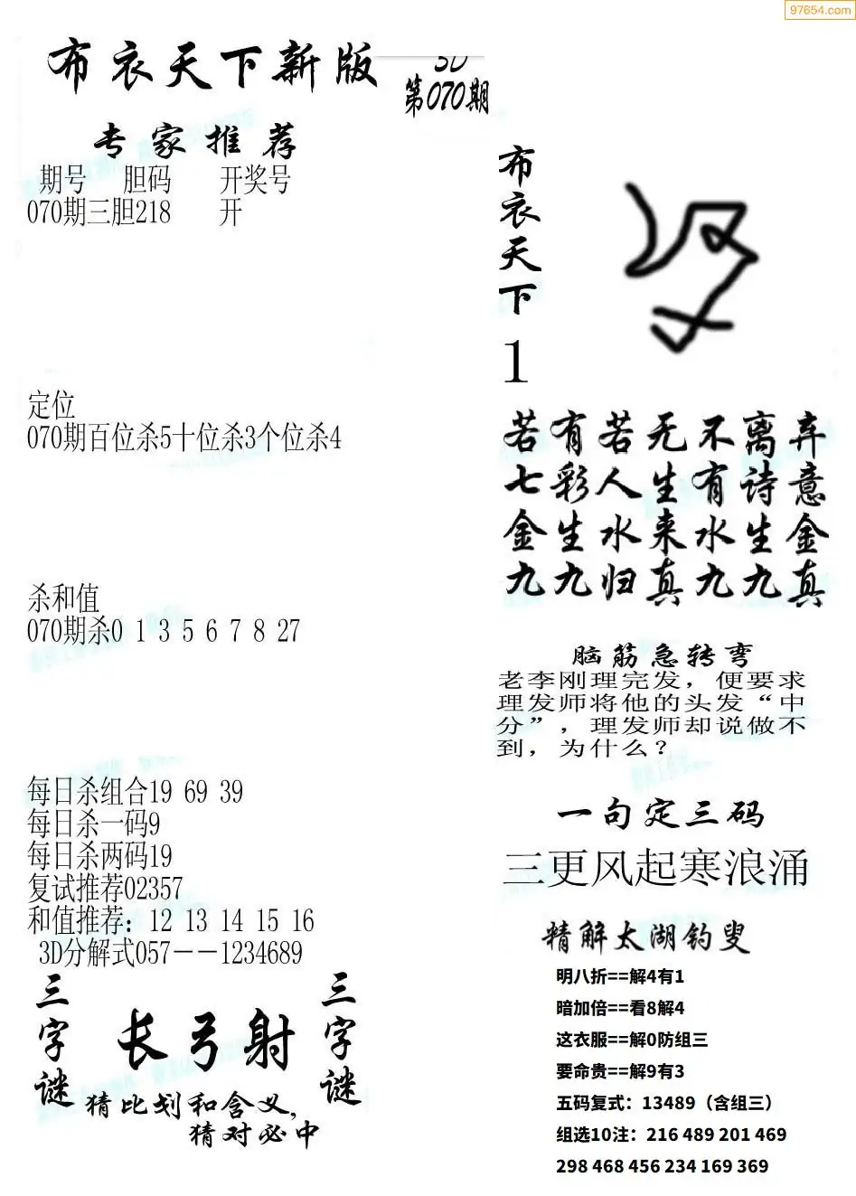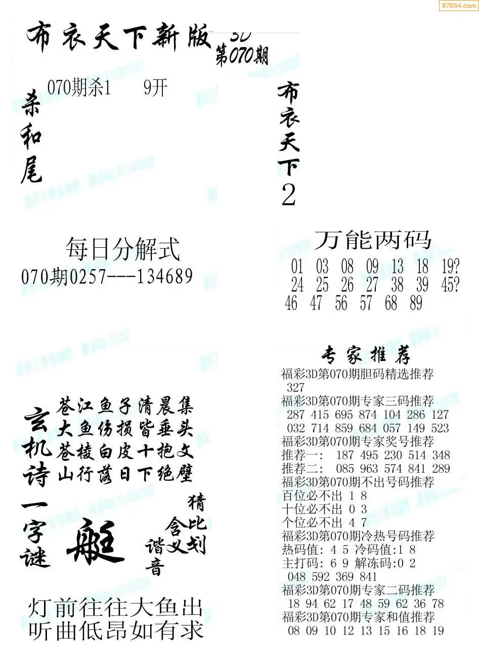 福彩070期3d真精华布衣+布衣早报(转载)