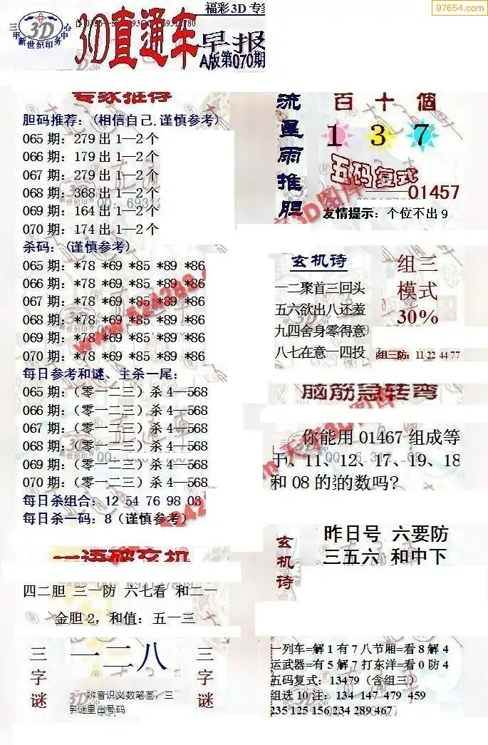 (8)26年069期今日3d各类彩报汇总